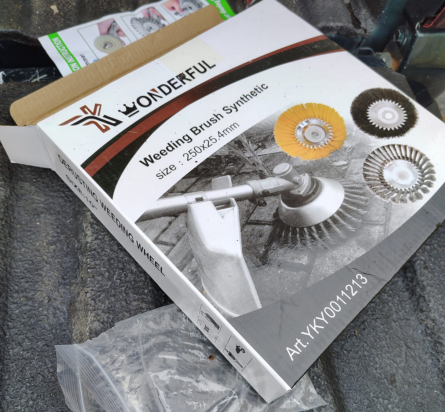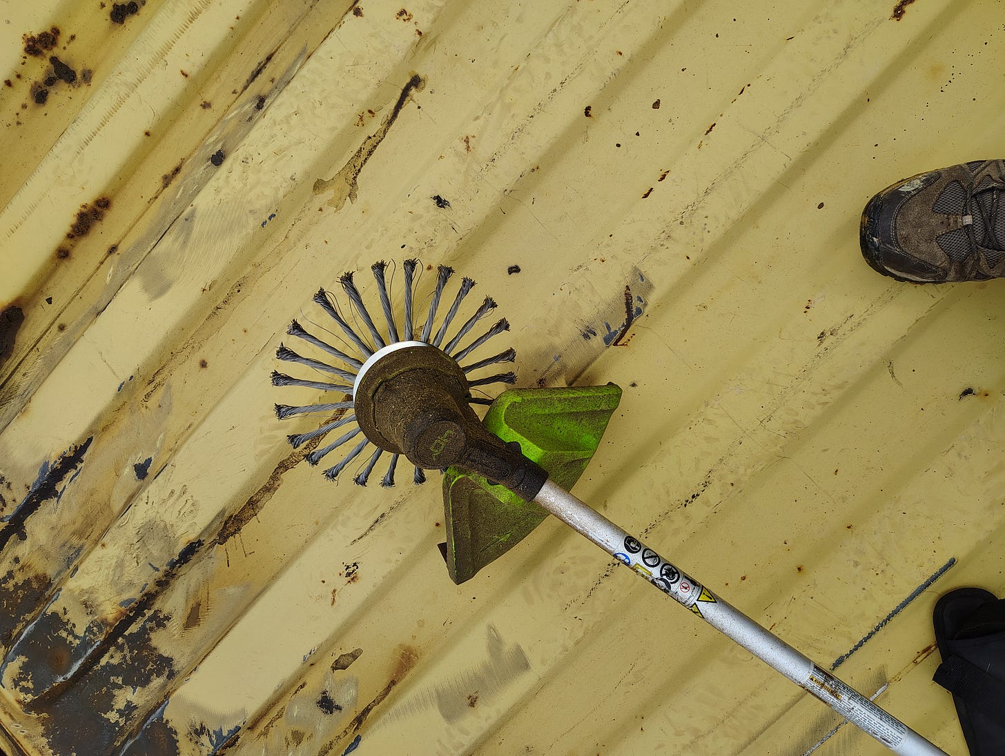 Note the label on the side. “derusting wire wheel.” Well, I said, let’s give it a go at that. Since we have two string trimmers, I put one of these on each one, left one in the capable hands of my wife, for kudzu eradication, and took the other one up on the roof.