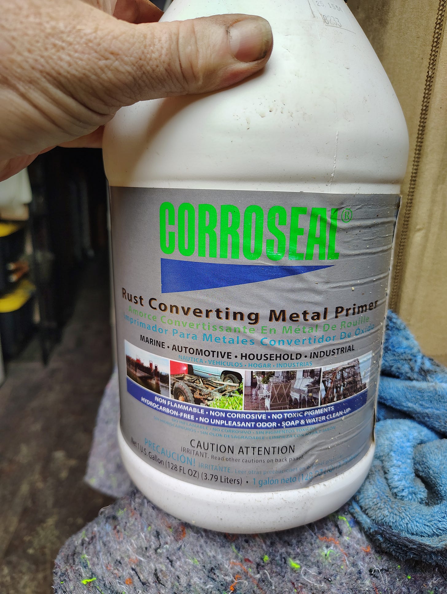 You have to remove all the lose rust before you use it, (hence the previous tool) but once you do, this stuff,( which has a consistency somewhere between water, and thinned linseed oil) can be put on with a brush, a roller, a spray bottle… Out of a spray bottle it goes on like a general purpose cleaner. You will probably need to spread it around with a brush or something (I used the cheep foam brushes, worked fine.) When it goes on its sort of a milky white, upon drying, it becomes clear on any previous painted surface, and will not harm the paint. On rust, or bare metal, however, it becomes black, that’s how you know it’s done its thing. The black is a chemical conversion of iron-oxide to a plastic polymer. It doesn’t matter if there’s visible rust or if it’s shiny steel, it will find enough iron-oxide to do its thing. Dries completely in 24-48 hours and then can be painted directly over. Best of all, it encapsulates the steel, so no oxygen can get to it, to cause further corrosion, and it penetrates into pits and cracks, to seal them. Oh, and its water based so cleanup is easy. If you have rusty iron things that have to stay out in the weather, you need this stuff. It’s better, cheaper and easier to use than the “primer and rust encapsulator” paints by Rust oleum and such, and you can use it in a confined space, without worrying about your health.